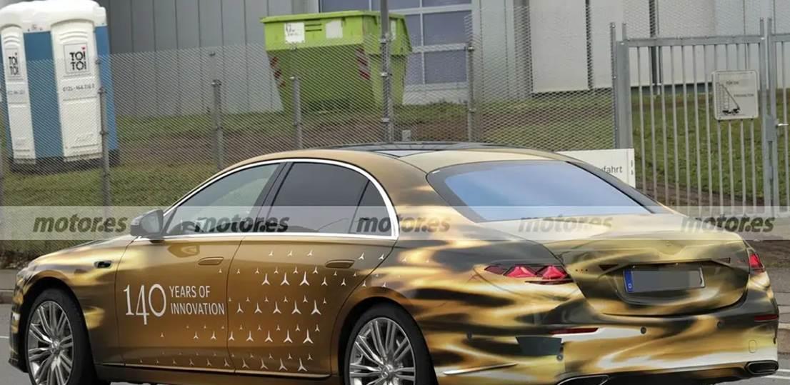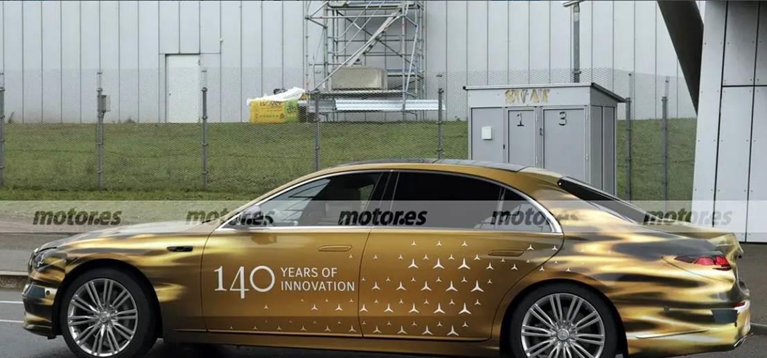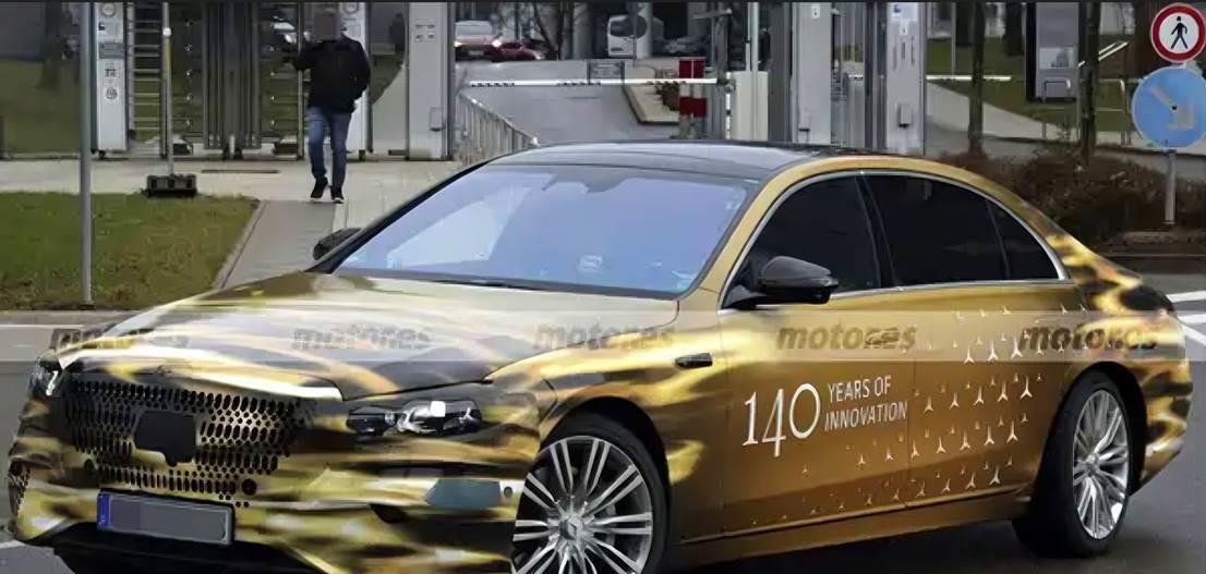 从图片观察,测试车贴了黄色车膜,一方面更显高贵,符合奔驰品牌调性;一方面也是伪装,遮掩真正的设计特征。在黄色贴膜外面,还贴附了部分三叉星的装饰拉花。在车身中央位置,则是一串英文“140 YEARS OF INNOVATION”,直译过来就是 “140 年的创新”。结合历史,对应的是奔驰品牌的发展历程 —— 诞生于 1886 年,到 2026 年正好是 140 周年。